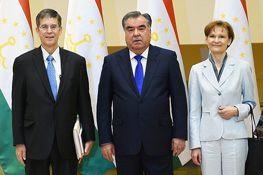 Имрӯз дар Қасри миллат Асосгузори сулҳу ваҳдати миллӣ - Пешвои миллат, Президенти Ҷумҳурии Тоҷикистон муҳтарам Эмомалӣ Раҳмон директори минтақавии Бонки ҷаҳонӣ оид ба Осиёи Марказӣ Лилия Бурунчук ва директори иҷроияи Маркази рушди Вулфенсон Йоҳаннес Линнро ба ҳузур пазируфтанд.