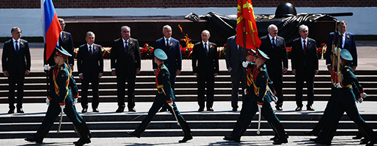 Баъди анҷоми расми паради ҳарбӣ дар Майдони Сурх Президенти Ҷумҳурии Тоҷикистон, Пешвои миллат муҳтарам Эмомалӣ Раҳмон ва сарони давлатҳо ва ҳукуматҳои дигар кишварҳои иштирокчии чорабиниҳои тантанавӣ дар назди ёдгории аскари номаълум гулчанбар гузошта, хотираи қурбониёни ҷанги мудҳиши солҳои 1941-1945 - ро гиромӣ доштанд.