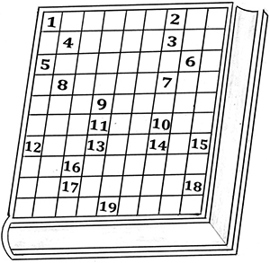 1. Асари машҳури академик Бобоҷон Ғафуров. 2. Ҳаммаънои вожаи «аллома» 3. Муҳимтарин маъхазе, ки доир ба таърихи қадимтарини Осиёи Миёна маълумот медиҳад. 4. Номи қадимаи Амударё. 5. Сипаҳсолори суғдӣ, ки муқобили Искандари Мақдунӣ диловарона ҷангидааст. 6. Шоир, мусиқидон, наққош ва арбоби намоёни замони Темуриён. 7. Асосгузори давлати Сомониён. 8. Муродифи истилоҳи «қӯшун». 9. Биное, ки Улуғбек соли 1428 барои муайян кардани ҳаракати ҷирмҳои осмонӣ сохта буд. 10. Муродифи калимаи «султон». 11. Исми модари аллома Бобоҷон Ғафуров. 12. Китоби якуми «Авесто», ки маънояш назру ниёз аст. 13. Яке аз давлатҳои аҳди Ҳахоманишиҳо. 14. Империяи бузурге, ки Бохтар дар замони Кӯшониён бо он робитаҳои тиҷоратӣ дошт. 15. Фавти кадом шоҳи Салҷуқиён боиси парокандагии он давлат гашт. 16. Пойтахти сарзамини Хатлони бостонӣ. 17. Машҳуртарин шоҳи давлати Кӯшониён. 18. Шакли дигари навишти калимаи «адл». 19. Миллат дар Осиёи Марказӣ.
