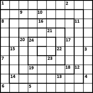 1.Кишваре, ки дар ҳамаи чемпионатҳои ҷаҳон оид ба футбол иштирок кардааст. 2. Президенти собиқи Украина Виктор… 3. Кадоме аз узвҳои инсон ҳароратро ҳис намекунад? 4. Варзишгоҳи машҳури Бразилия. 5. Ҳунарманди кино… Делон. 6. Дарё дар Санкт-Петербург. 7. Лагери машҳури пионерон дар Қрим. 8. Номи мева ё паранда. 9. Дарё дар Чин ва Қазоқистон. 10. Достони Ҳомер. 11. Дарё дар Сибир. 12. Номи дигари мулки форсҳо. 13. Маркази Адигеяи Россия. 14. Шоҳи рус, ки Санкт-Петербургро сохтааст. 15. Қалби неругоҳи ядроӣ. 16. … Шалоэр, Ҳунарпешаи шоистаи Тоҷикистон. 17. Деҳа дар Қирғизистон. 18. Актрисаи Ҳолливуд Ҷеннифер… 19. Найза бо арабӣ. 20. … Думбадзе, адиби шинохтаи гурҷӣ. 21. Як қисми баталион. 22. Ҳиссачаи ишоратӣ. 23. Дӯст ба испанӣ. 24. Дарахти чӯбаш қиматбаҳо.