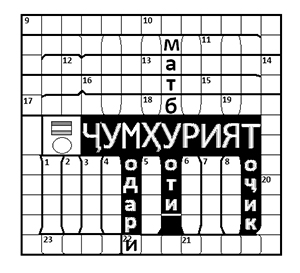 1. Нахустшумораи рӯзномаи «Бухорои Шариф» кадом сол аз чоп баромадааст? 2. Соли ба истифода додани матбааи тоҷик. 3. Рӯзномаи «Ҷумҳурият» шуруъ аз кадом сол бо номи «Тоҷикистони сурх» чоп мешуд? 4. Аввалин шумораи рӯзномаи «Ҷумҳурият»-и ҳозира соли чанд ба табъ расидааст? 5. Рӯзномаи «Ҷумҳурият» соли чанд мақоми нашрияи Ҳукумати Ҷумҳурии Тоҷикистонро гирифт? 6. Шумораи аввалини рӯзнома ба теъдоди чанд нусха интишор ёфтааст? 7. Аз кадом сол инҷониб 11 март Рӯзи матбуоти тоҷик ҷашн гирифта мешавад? 8. Рӯзномаи «Ҷумҳурият» кадом сол Нашрияи расмии Ҷумҳурии Тоҷикистон ҳисобида шуд? 9. Маҷаллаи тоҷикии «Шуълаи …», ки коммунистони Бухоро дар соли 1918 ба роҳ андӯхта буданд. 10. Шумораи дуюми рӯзномаи «Ҷумҳурият»-и ҳозира бо номи …и … аз чоп баромад. 11. Яке аз асарҳои А. М. Горкий, ки дар рӯзномаи «Бухорои Шариф» чоп шудааст. 12. Мудири матбаа Л. Н. …, ки дар он рӯзномаи «Бухорои Шариф» чоп мешуд. 13. Э ҷафоҷӯ, чӣ аламҳо, ки … аз ту. 14. Муҳаррири рӯзномаи «Бухорои Шариф» … Ҷалол Юсуфӣ. 15. Шеъри Гулчеҳра Сулаймонӣ «…и хандонрӯ». 16. Нахустшумораи рӯзномаи «Бухорои Шариф» дар куҷо аз чоп баромадааст. 17. Меҳмони даъват нашуда. 18. Шумораи аввали рӯзномаи «Бедории тоҷик» зери таҳрири … Алиев аз чоп баромадааст. 19. Ҷоно, ҳаваси … ағёр чӣ лозим. 20. Номи аввалини рӯзномаи «Ҷумҳурият». 21. Дарахти дӯсти биншон, ки … дил ба бор орад. 22. Чу … кардӣ, машав худпараст. 23. Мақолаи устод Мирзо Турсунзода ба хотири 50-солагии рӯзномаи «Ҷумҳурият» таҳти унвони «Аввалин газета, аввалин …».