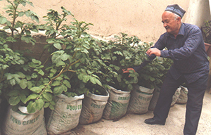 Чун аз мақсади ташрифи мо огоҳ шуд, халтаҳои картошкаро, ки дар пояи девор гул кардааст, нишон дод. Шумурдем, ҳамагӣ 14 халта. Назар ба гуфтаи Ғафур дар ҳар халта ду донагӣ картошкаи тухмӣ ҳаст. Ба ҳар яки он 1,5 сатил хоки омехтаи поруи маҳаллӣ, аррамайда (апилка) ва як чумча амофос андохтааст. Дар даҳ рӯз яксатилӣ об медиҳад.
