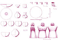 Дар косаву табақ тӯшаи охират аз гӯшти гӯсфанд гузошта буданд. Яке аз бозёфти муҳим ҳайкалчаи аз санги рухом тарошида мебошад. Ҳайкал симои мардро ифода мекунад, ки мӯйҳои дарози ӯ дар пушти сар бофта ҷамъ карда шудаанд. Ду даст дар сатҳи камарбанд мушт шуда, ангуштони калони бо ҳам наздик маъноеро ифода намудааст. Ҳайкалча 13,2 см баландӣ дошта, сабки ҳайкалсозони Байнаннаҳрайнро ба хотир меорад. Чунин намуди ҳайкалчаҳо дар Мағиён ва Бохтари шимоли Афғонистон ёфт шудаанд. Бофти мӯйҳо, гӯшу бинӣ шабоҳати маҳаллӣ доранд. Чашмони бодомии ҳайкалча низ осиёимиёнагӣ мебошанд. Чунин симоҳо дар мӯҳрҳои асри биринҷии аз бахши Бохтари Афғонистон ёфтшуда мушоҳида мешаванд. Симои чунин ҳайкалчаҳо дар бозёфтҳои Шоҳдоди Эрон низ ҷой доранд. Муаллифи бозёфт Н.Виноградова онро маҳсули ҳунармандони бохтарӣ медонад, аммо сабки Байнаннаҳрайн доштани ҳайкалро рад намекунад.