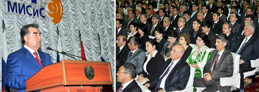 Суханронии Эмомалӣ Раҳмон, Президенти Ҷумҳурии Тоҷикистон, дар маҷлиси ботантана ба муносибати ифтитоҳи филиали Донишгоҳи миллии тадқиқотӣ-технологии "МИСиС"-и Маскав, шаҳри Душанбе, 17 апрели соли 2012
